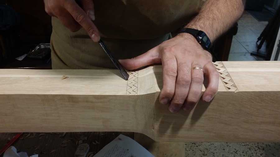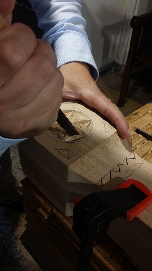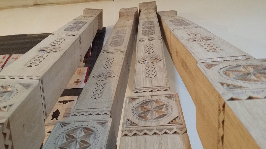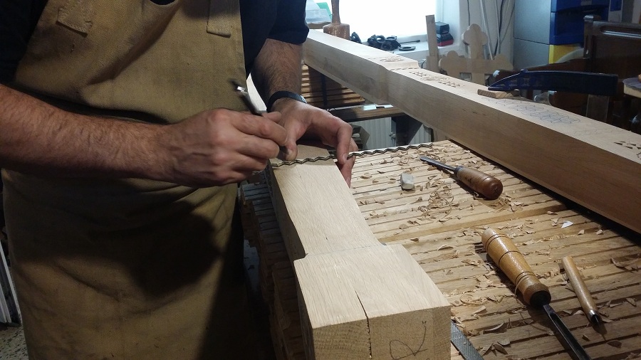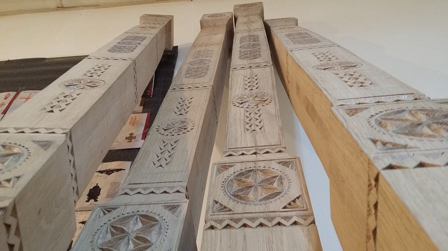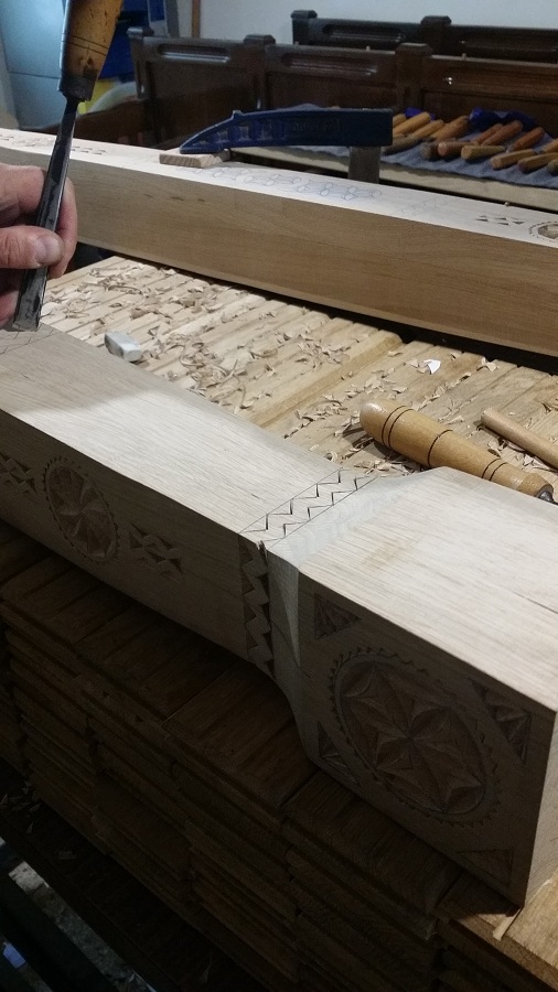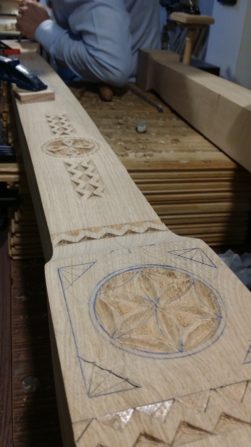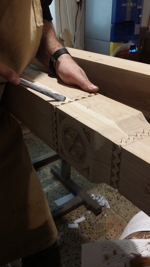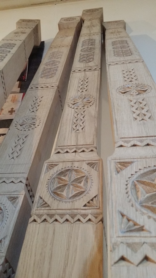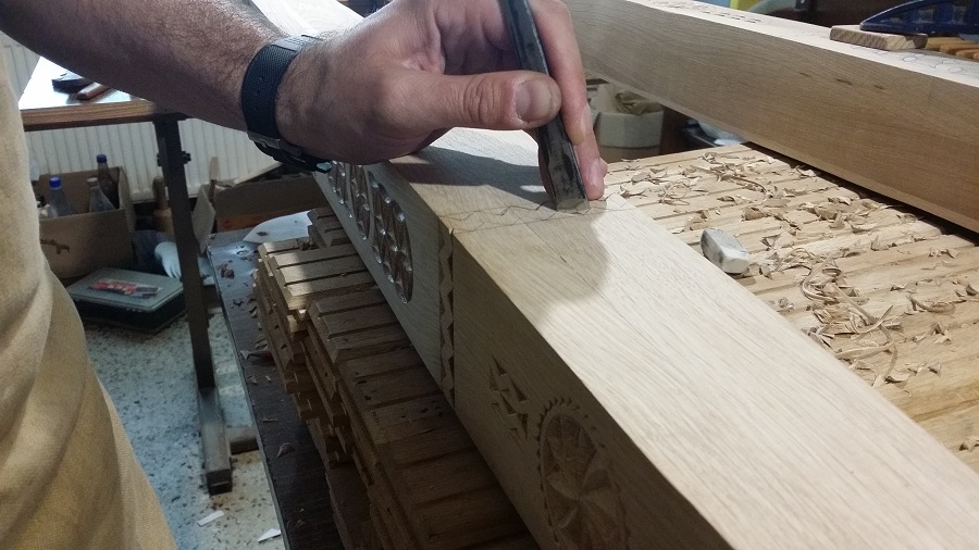 Zilele acestea am avut în lucru la atelier câțiva stâlpi de catapeteasmă pentru o biserică mănăstirească. Din când în când evadăm din sculptura miniaturală către cea mare. Noutatea la această catapeteasmă o constituie prezența eclusivă a motivelor populare, lucrul des întâlnit în arhitectura bisericească românească de altă dată. Catapeteasma se va afla integral în lucru la atelierul nostru zilele următoare. Am surprins câteva imagini din timpul lucrului pe care le redăm mai jos. Vom mai reveni cu detalii de decorare.