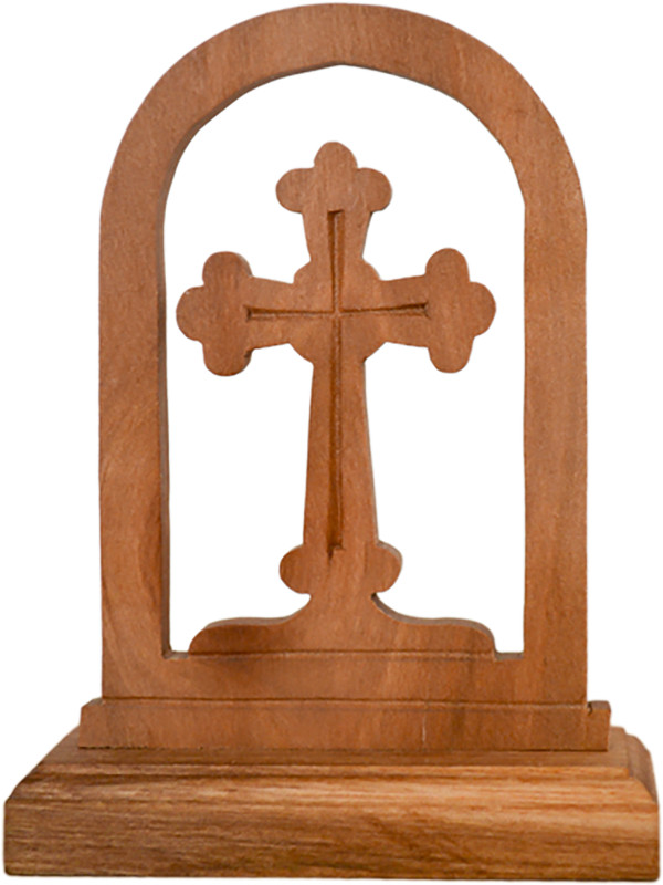 Cruce cu suport 6, de dimensiuni 12 x 7 cm. Crucea este incizată și crestată manual din lemn de nuc, prun, cireș, păr, arin, etc. Nuanțele pot să difere față de cele prezentate, în funcție de esență și fibra lemnului, sau culoarea aplicată.