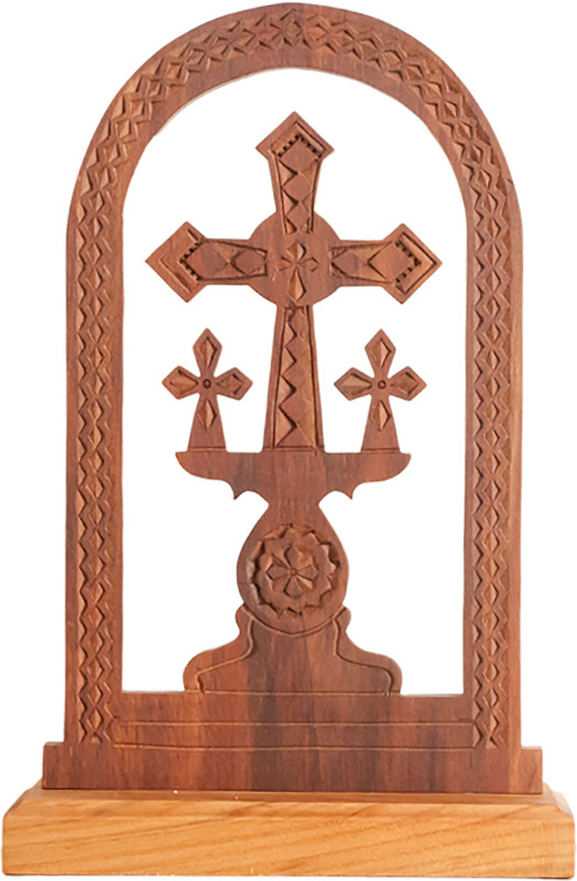 Troița este incizată și crestată manual din lemn de nuc, prun, cireș, păr, arin, etc.